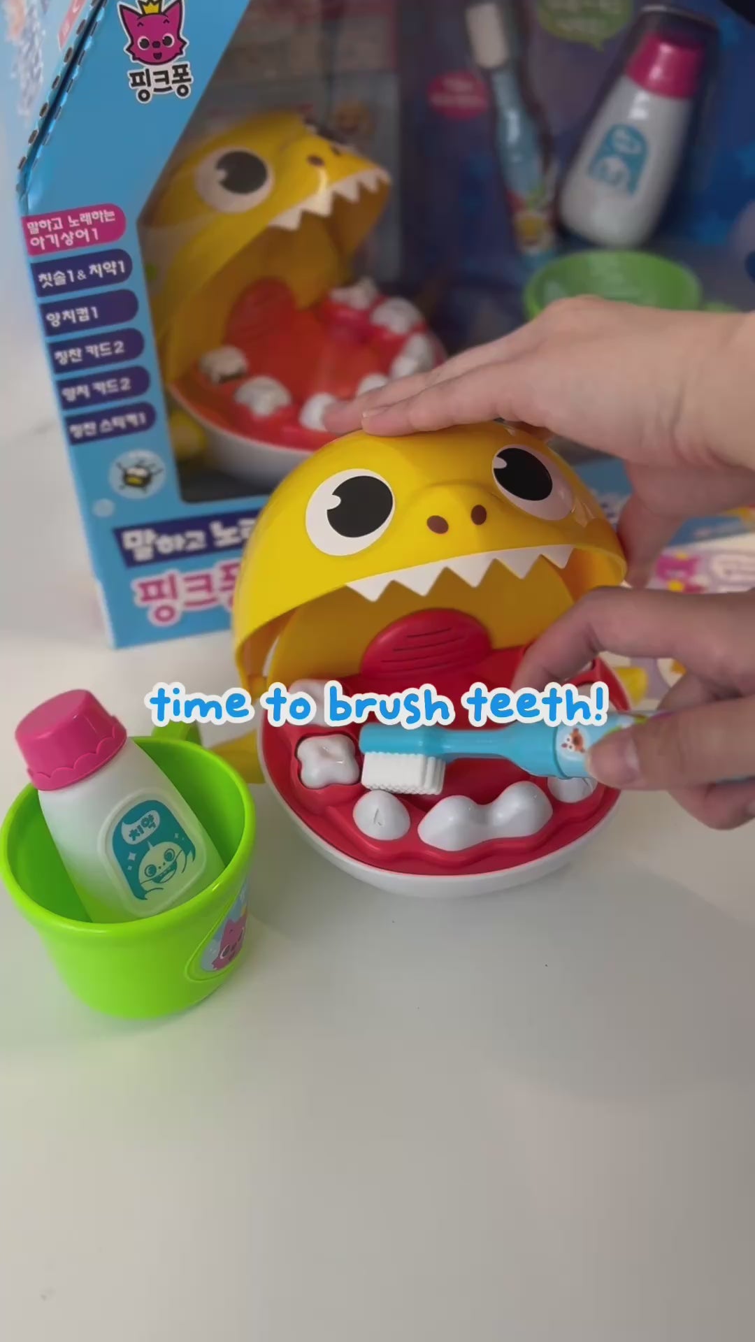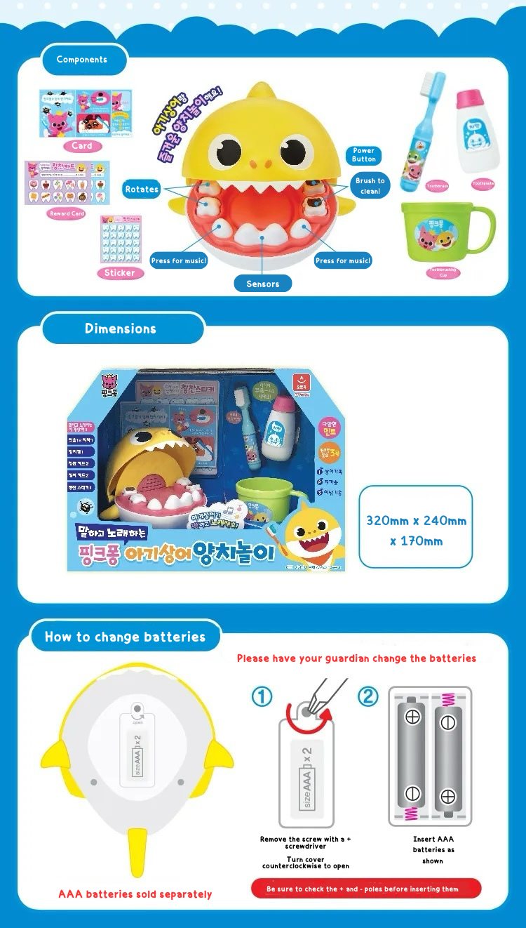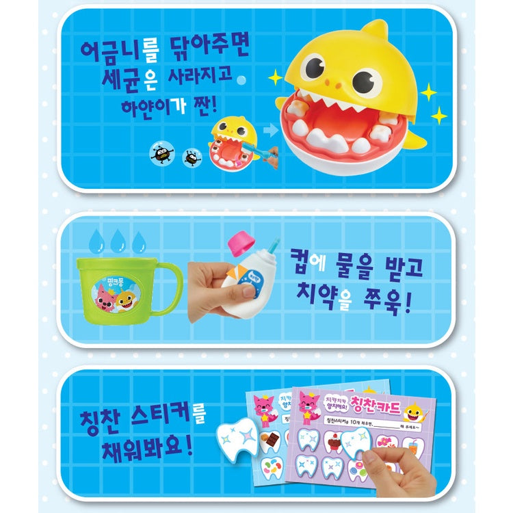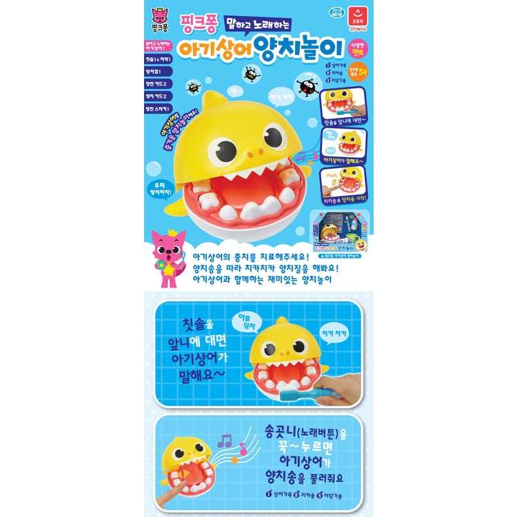 Exciting Sound Effects: When the toothbrush touches the front teeth or the fangs, Baby Shark will sing or play a catchy tune! (in Korean)